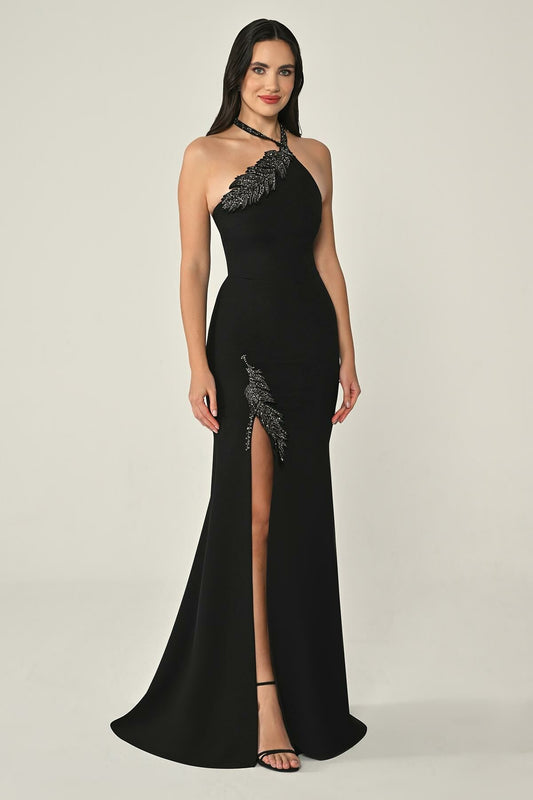 Halter Neck Leaf Embroidered Crepe Long Dress
