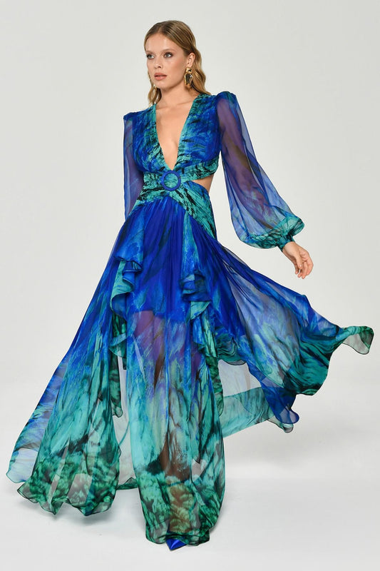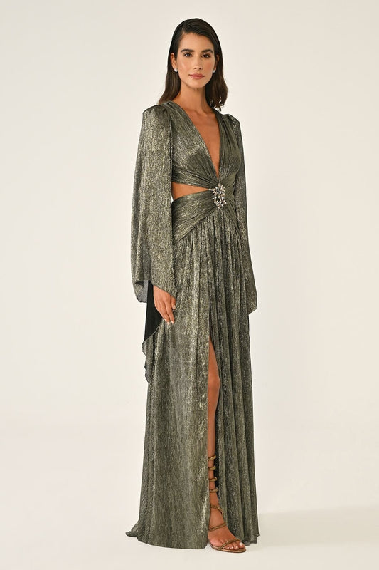 LONG SLEEVE DEEP V-NECK LONG DRESS